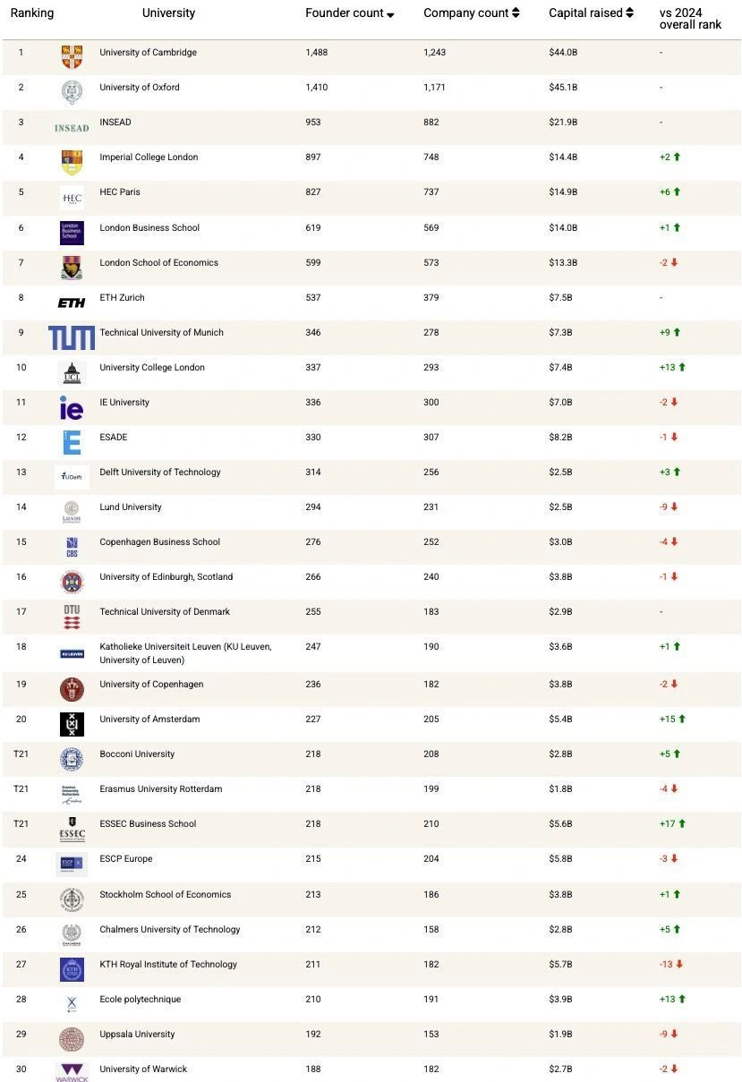 Cambridge and Oxford continue to dominate founder output, while INSEAD outperforms its small cohort size. Technical institutions like TU Munich and Delft are rapidly closing the gap with legacy prestige schools.