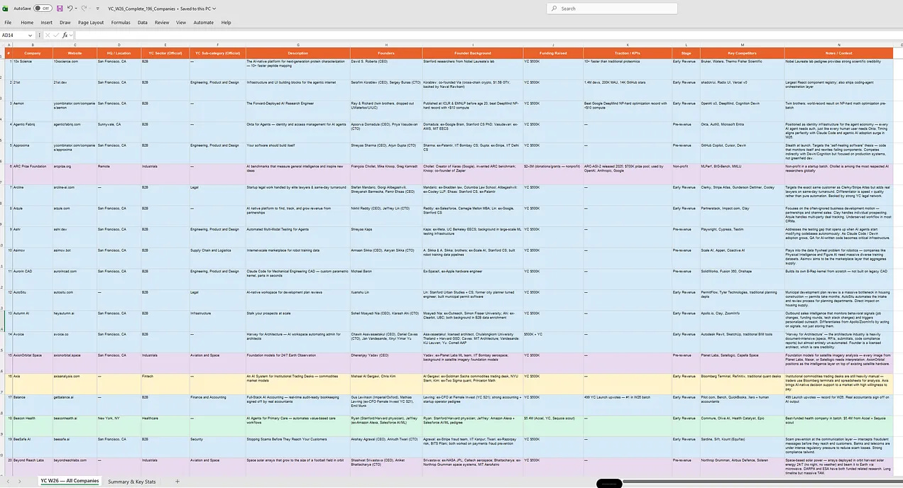 A detailed dataset maps traction across the latest Y Combinator batch, highlighting 196 companies and standout metrics before Demo Day. It includes 14 data columns covering funding, KPIs, founder backgrounds, and competitors, saving investors and founders dozens of research hours.Airwallex Built an $8B Company After Rejecting $1.2B Offer 💳