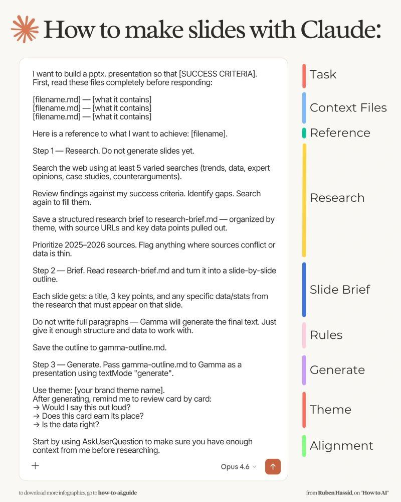 A structured prompting system guides research, brand context, and outline planning before generating slides. The process prevents rushed outputs by forcing planning steps before tools like Claude create final content.Databricks Raised Millions With a Terrible Pitch Deck 💀