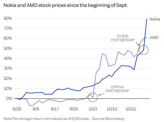 Every time OpenAI or Nvidia announce a new partnership, stocks surge across sectors from AMD to Nokia. The two have become market catalysts, shaping trillions in value and investor behavior with each move. [Business Insider]