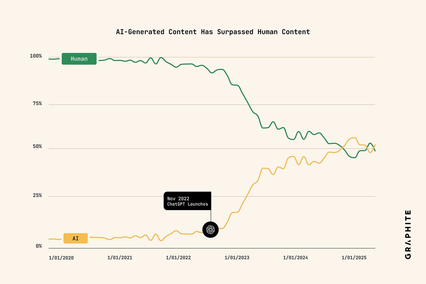 AI-generated content has surpassed human writing across the web as companies scale output with LLMs. The challenge has shifted from creation to visibility, with search and discovery now the true frontier. [FIVE PERCENT]