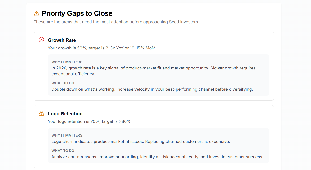 It translates investor feedback from vague signals such as “too early”, “not enough traction”, “come back later” into specific, stage aligned tasks.