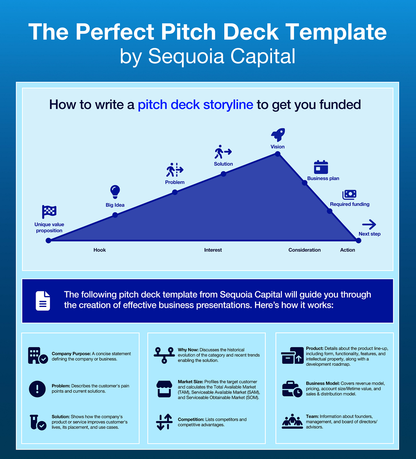 Sequoia Capitalâs version of the pitch deck has stood the test of time because it follows the natural psychology of decision-making. It mirrors how humans absorb information and build trust. Their âpitch storylineâ moves through four phases â Hook, Interest, Consideration, and Action â that align with the emotional arc of persuasion.