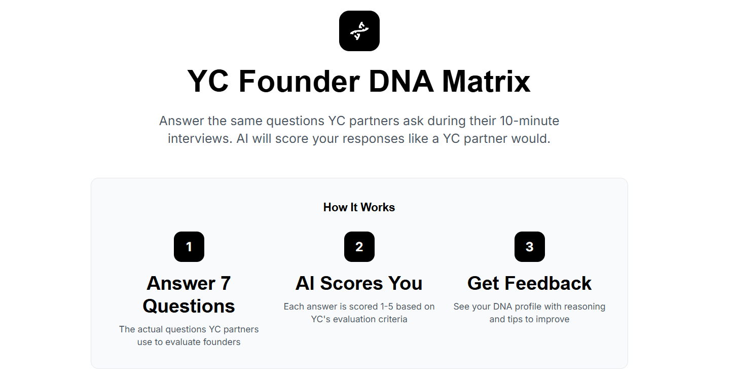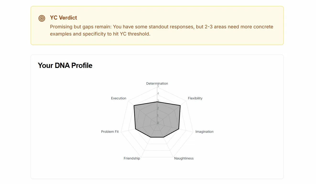 You answer seven questions — the actual questions YC partners use to evaluate founders. AI scores each response 1–5 based on YC’s evaluation criteria. Then you get your DNA profile: a breakdown of every trait, where you’re strong, where you’re soft, and what to do about it.