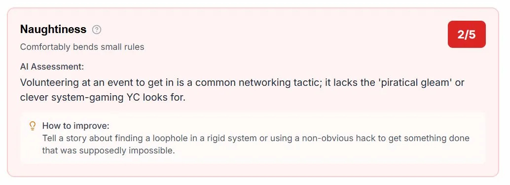 Don’t try to game the AI. It’s trained to recognise the same evasions YC partners have seen thousands of times. Hedged language, vague superlatives, and humble-bragging all score lower than you’d expect.