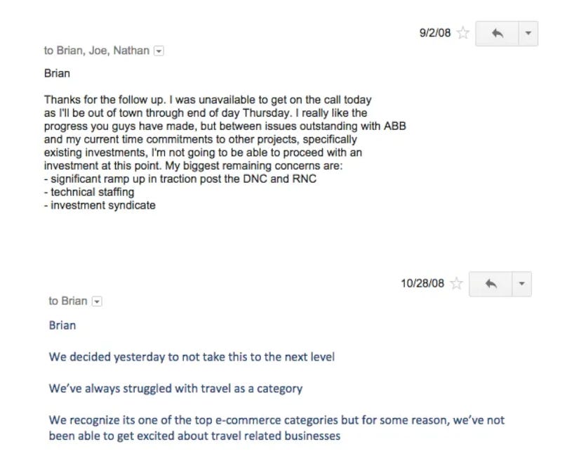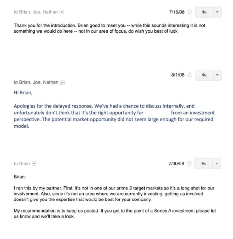 Consider what happened to Brian Chesky when he was raising the seed round for Airbnb in 2008. He pitched seven investors. Five passed. Two didn’t reply. One rejection email read: “The potential market opportunity did not seem large enough for our required model.” That $150,000 for 10% of Airbnb would be worth billions today.