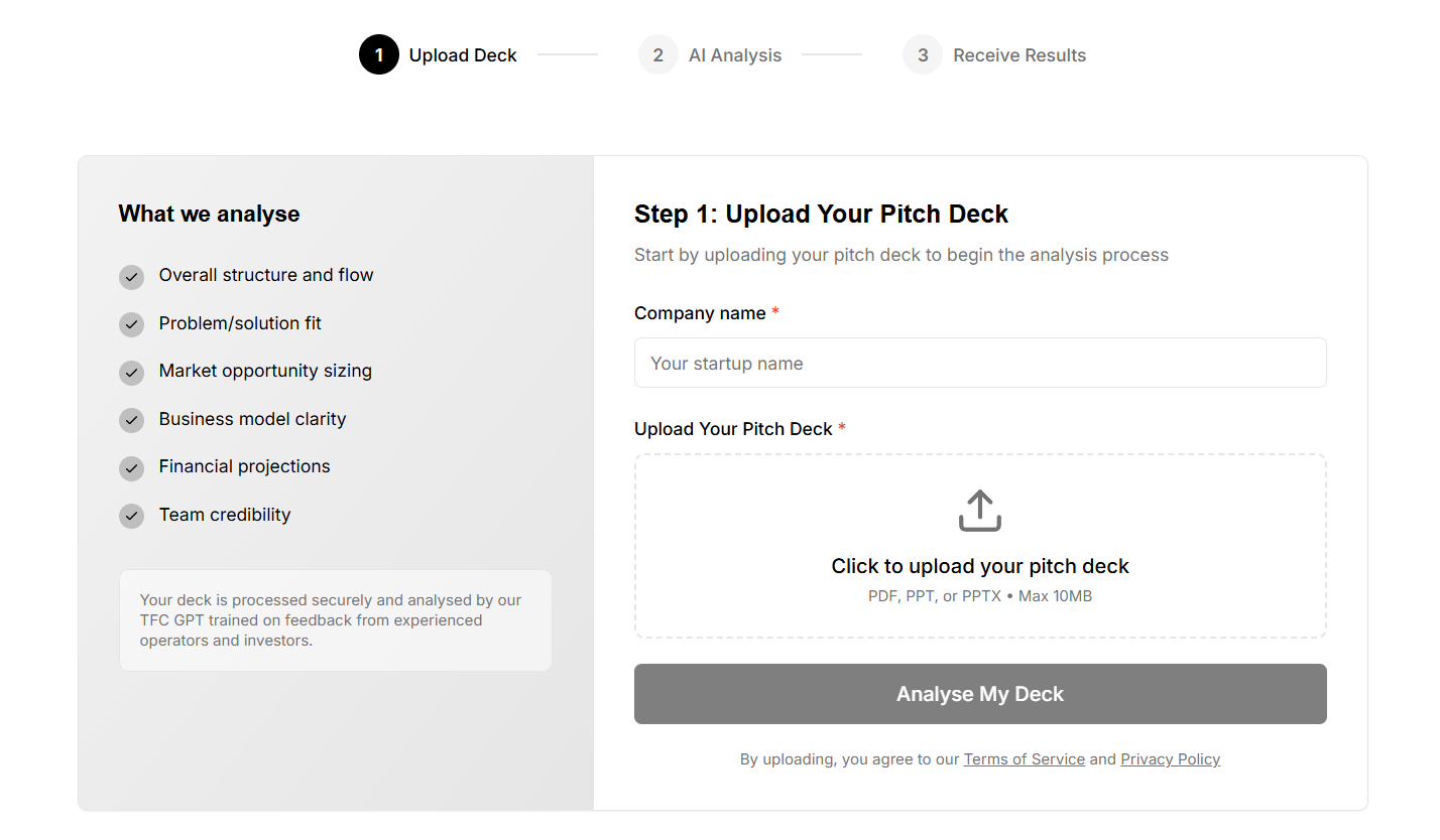 You upload your deck, PDF or PPT, and the tool analyses it in under a minute across the exact filters I use when assessing an early-stage company: narrative structure, problem clarity, market depth, business model logic, financial signals, and team execution indicators.