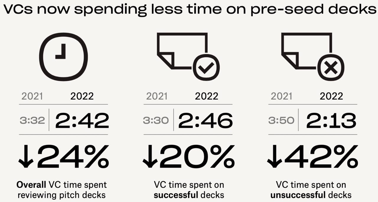 A typical VC firm reviews somewhere between 500 and 3,000 decks per year and makes between 5 and 12 investments. That’s a pass rate of over 99%. The decks that survive aren’t necessarily the strongest businesses. They’re the ones that communicated clearly and quickly through a pattern-matching process that has no obligation to explain itself to you.