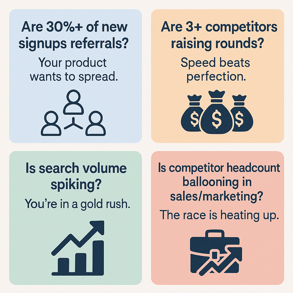 Check category timing. If you’re in a gold rush, perfection kills you. Speed wins.