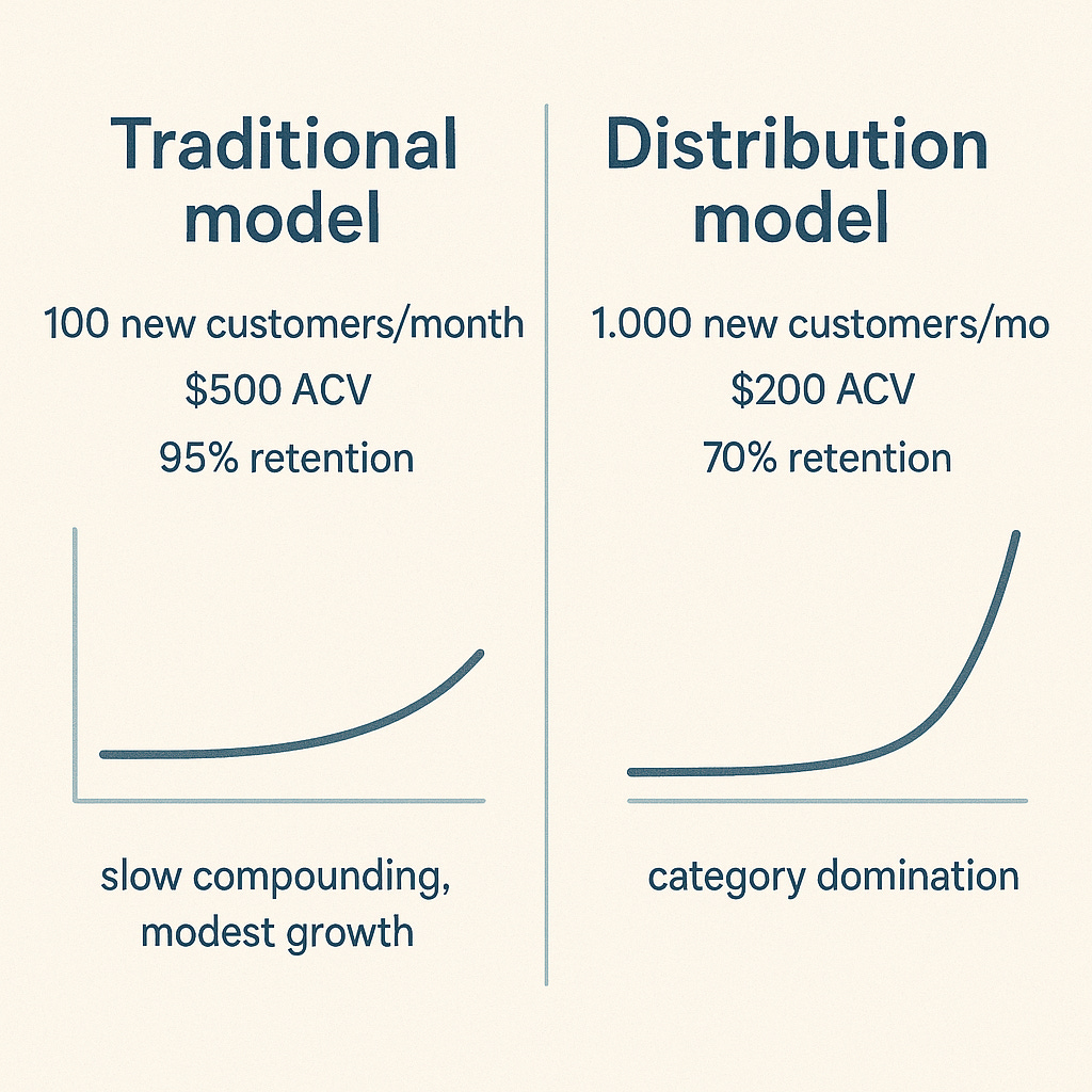 100 new customers/month · $500 ACV · 95% retention = slow compounding, modest growth.Distribution model:
