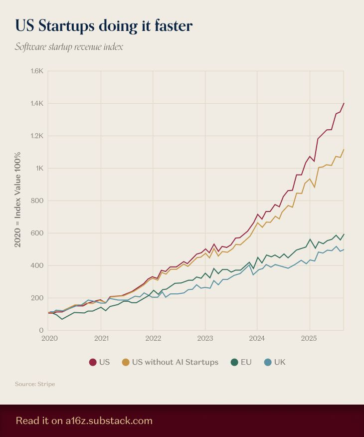 Longitudinal revenue data shows a widening acceleration gap versus Europe and the UK, even after excluding frontier categories. Faster adoption cycles, large addressable markets, and lighter friction appear to compound the advantage. [YC Bets on a 10‑Person, $100B Company ⚡️