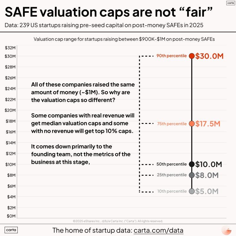 Pre-seed SAFE caps range wildly with little connection to traction or revenue. Founder pedigree and narrative now price rounds more than actual business fundamentals. [Peter Walker]Peter Thiel: Ideas Matter More Than Money in a Zero-Rate World 💭