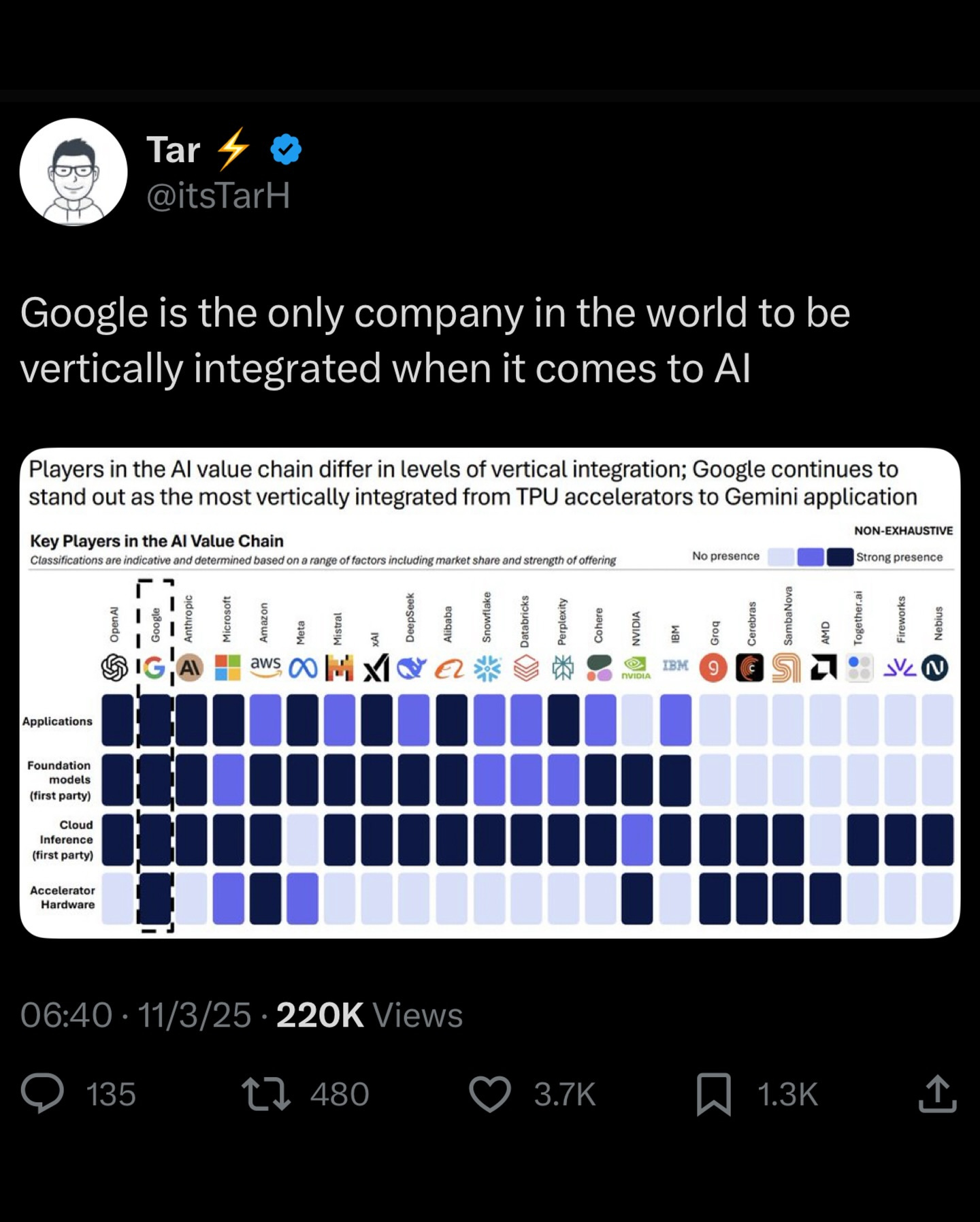 Marc argues society both undervalues cognitive ability broadly and overweights it within fields that already prize it, missing other drivers of achievement. The takeaway is to treat raw aptitude as one input while elevating execution, judgment, and team dynamics. [a16z]Chart: Google’s vertical AI stack vs peers 📊