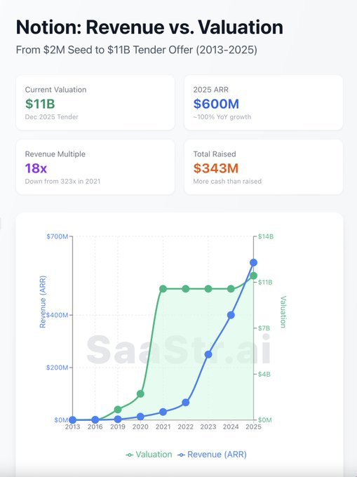 From a $2M seed to $600M ARR, Notion let revenue compound until the multiple made sense, without chasing new rounds. AI monetization, disciplined growth, and patience turned a peak era valuation into a durable public scale outcome. [Jason Lemkin]