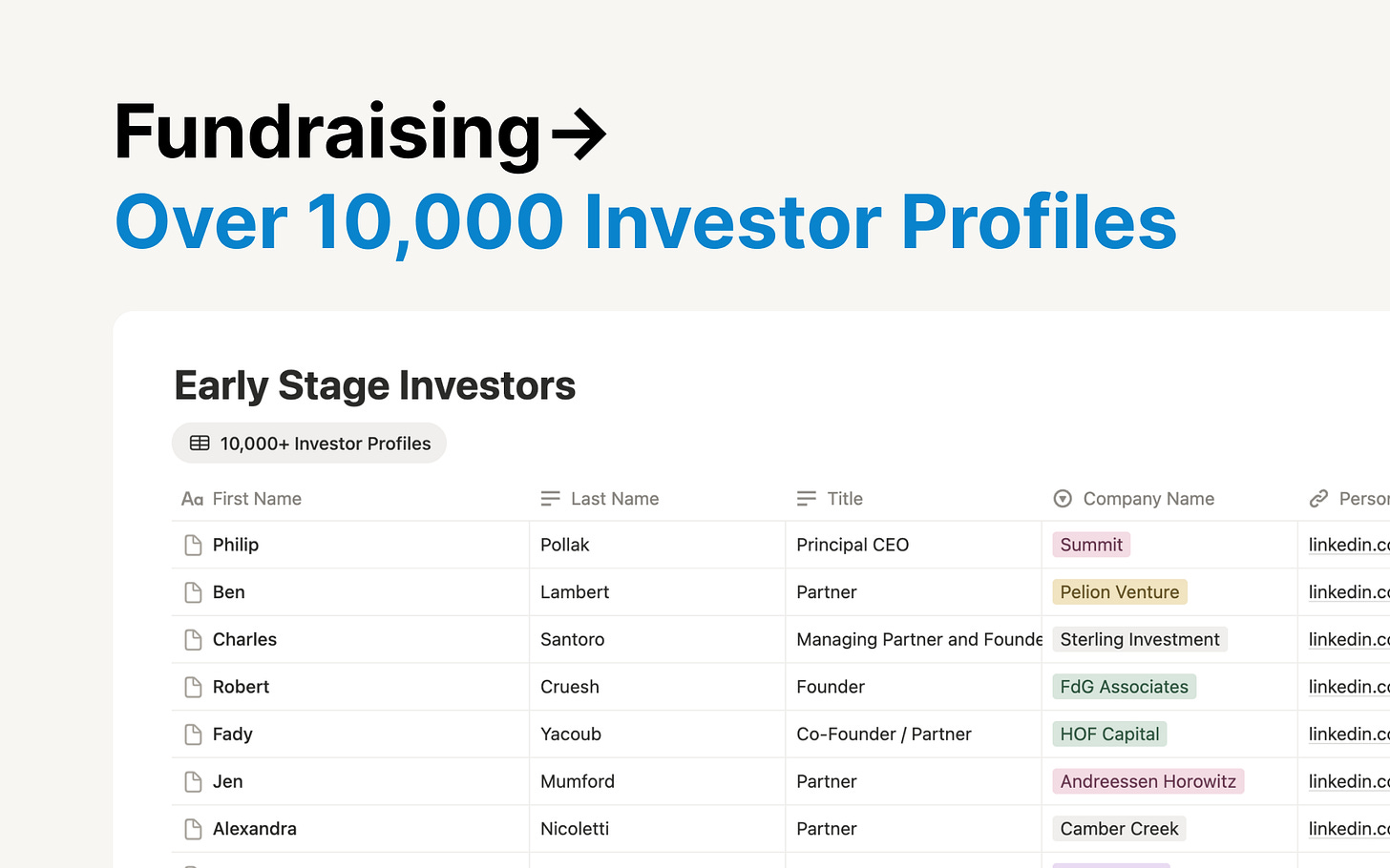 A FREE Notion workspace with 58 founder-ready templates covering idea, fundraising, launch, and scale, built for fast-moving AI-native teams. Includes 10,000+ real investor profiles and up to 6 months of Notion Business with AI to help founders move faster with less operational friction.