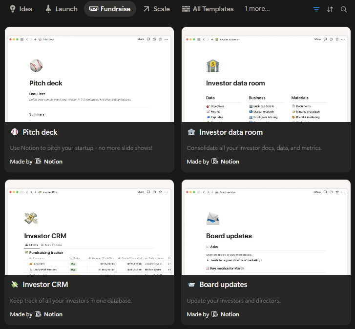 Think pitch decks, data rooms, investor CRMs, PR launch trackers, hiring plans, and more. All customizable, and built to help you move faster.