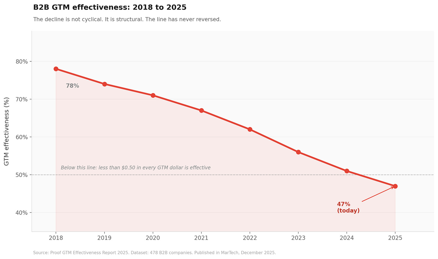 In 2018, B2B GTM effectiveness stood at 78%. By 2025, it had fallen to 47%.