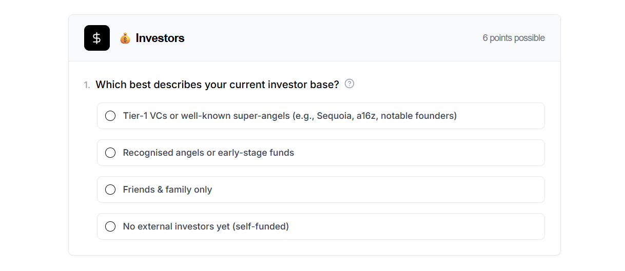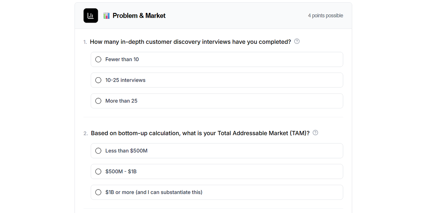 Here, the tool begins to rebuild the entire mental model an investor forms while listening to you for the first time. It is testing whether you truly understand the landscape you want to operate in.