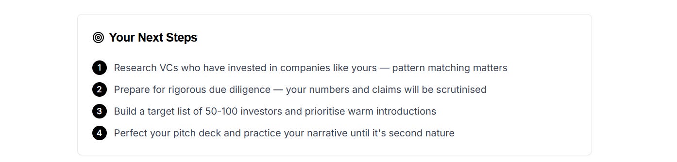 You receive a set of personalised next steps that flow directly from your profile - which funds are likely to engage, how to shape the round, how to prepare for the level of diligence your stage will trigger, and how to refine the narrative under pressure.