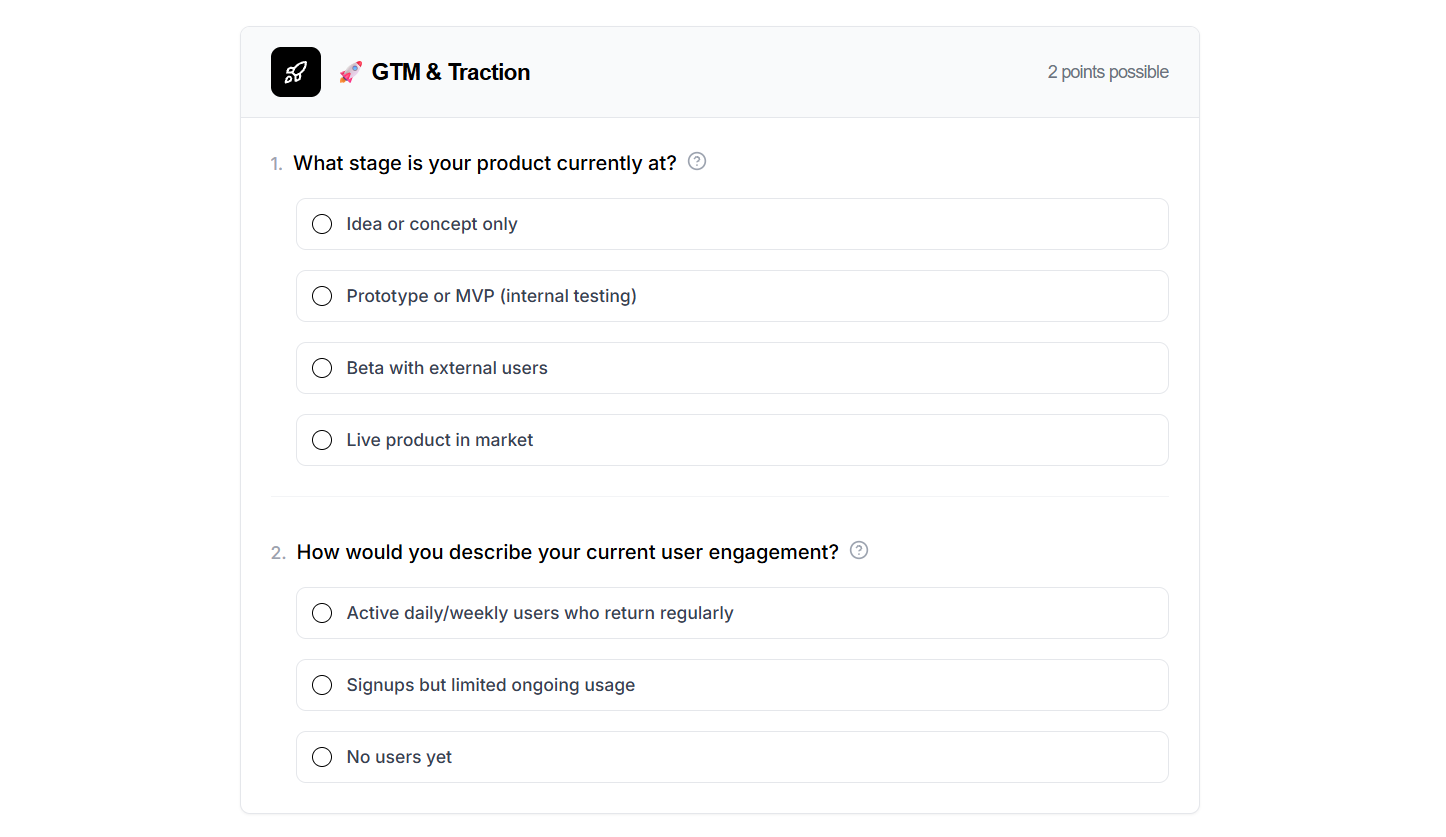 The GTM and Traction section blends product stage, engagement and early commercial motion into a simple picture of momentum. It does not reward volume for the sake of volume. It rewards signs of genuine pull.