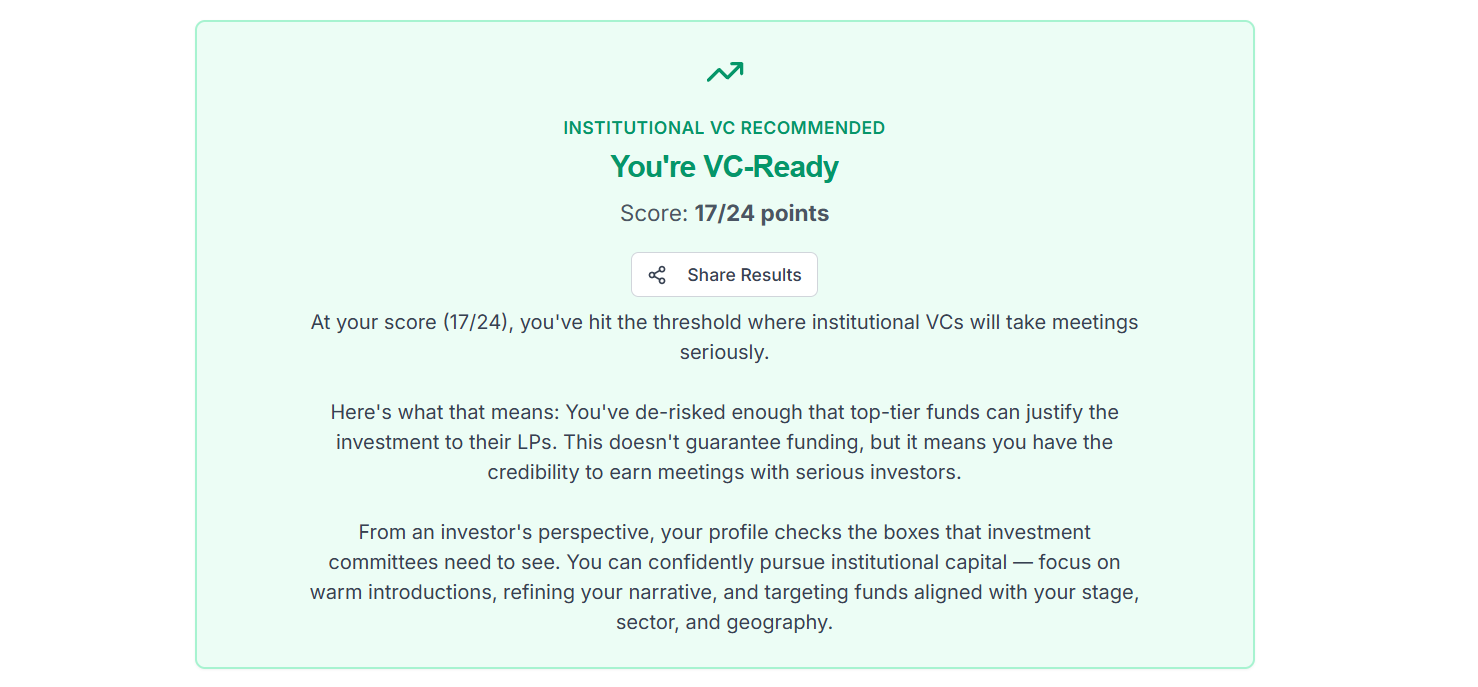 The verdict is where the assessment becomes direct. No interpretation. No guesswork. Just a clear read on how an institutional fund would view your company at this stage.