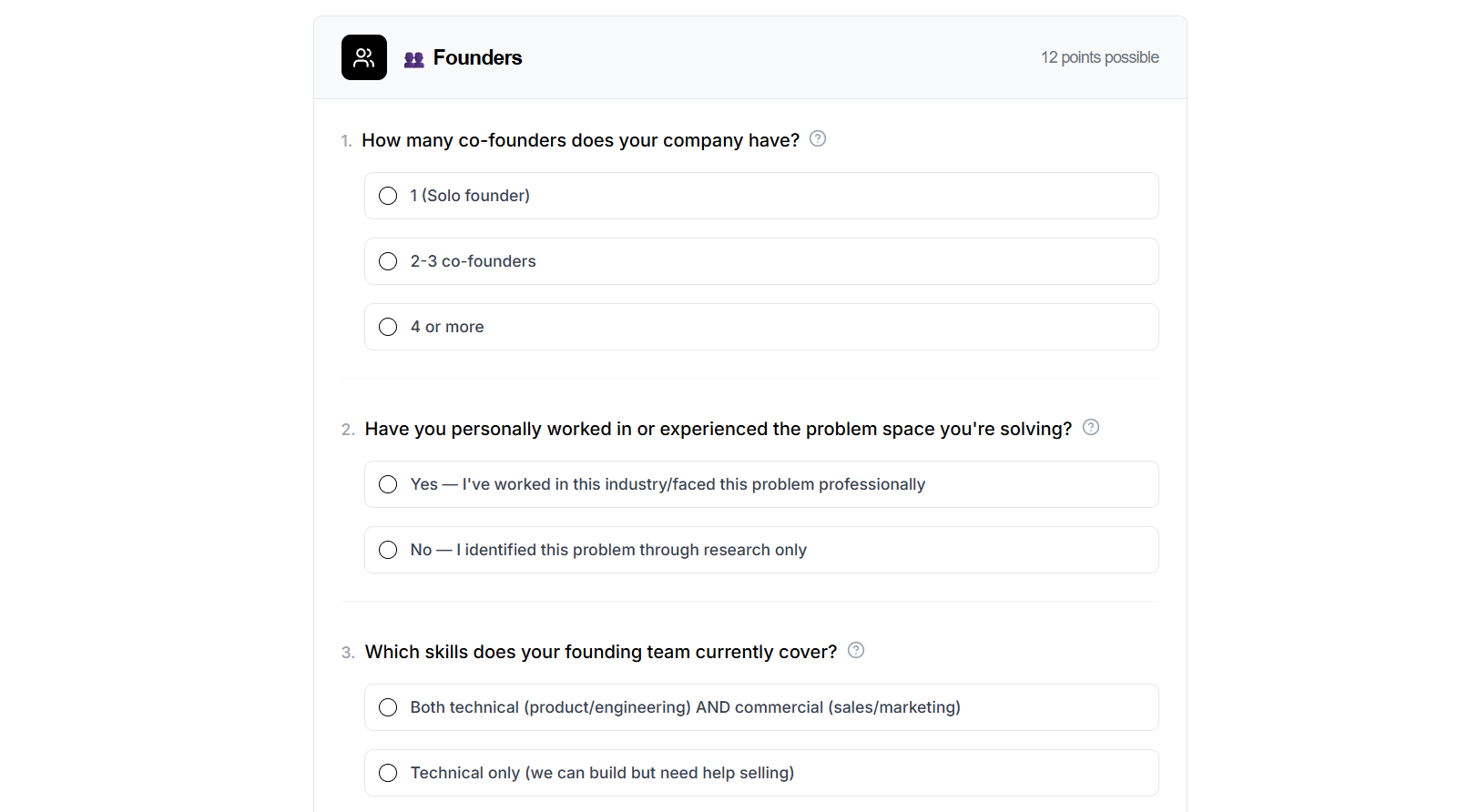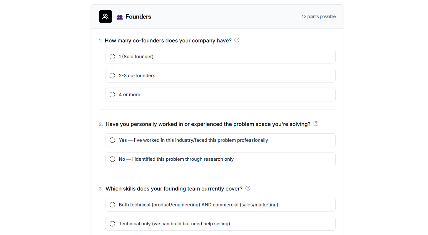 The Founders section is not a single question about team size. It is a cluster of signals designed to answer one thing:
