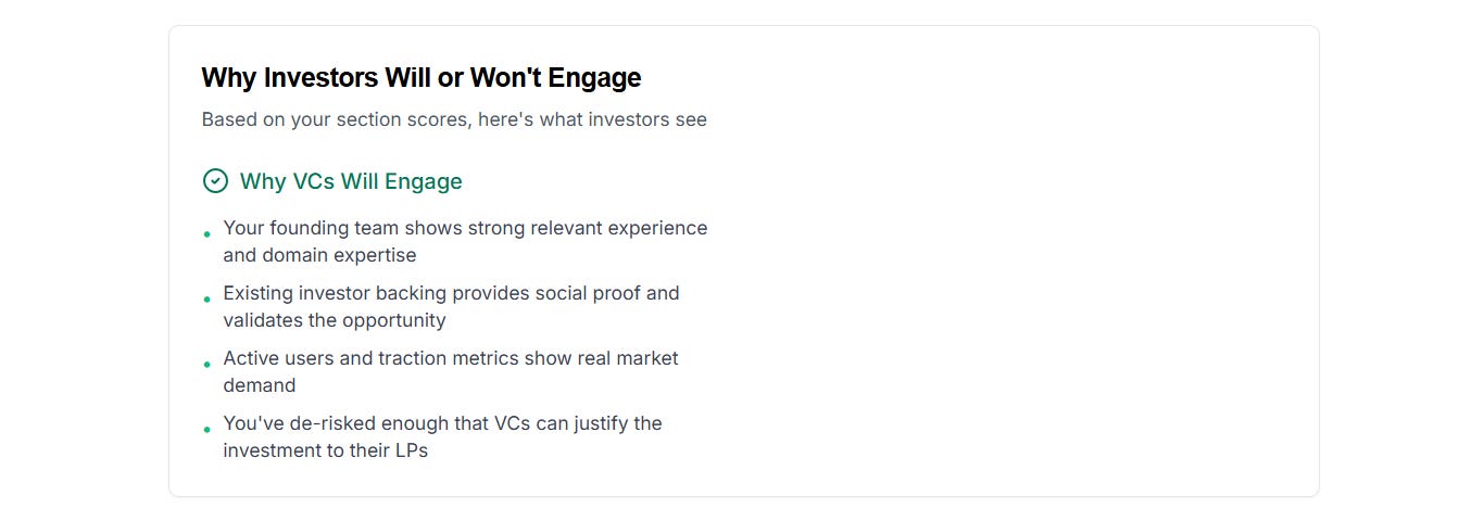 Right after the verdict, the tool reveals the specific reasons investors lean in, or step back.