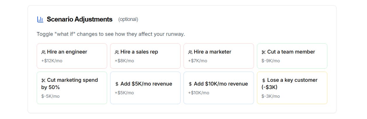 And you see, instantly, how each one affects your survival, leverage, and fundraising timeline.