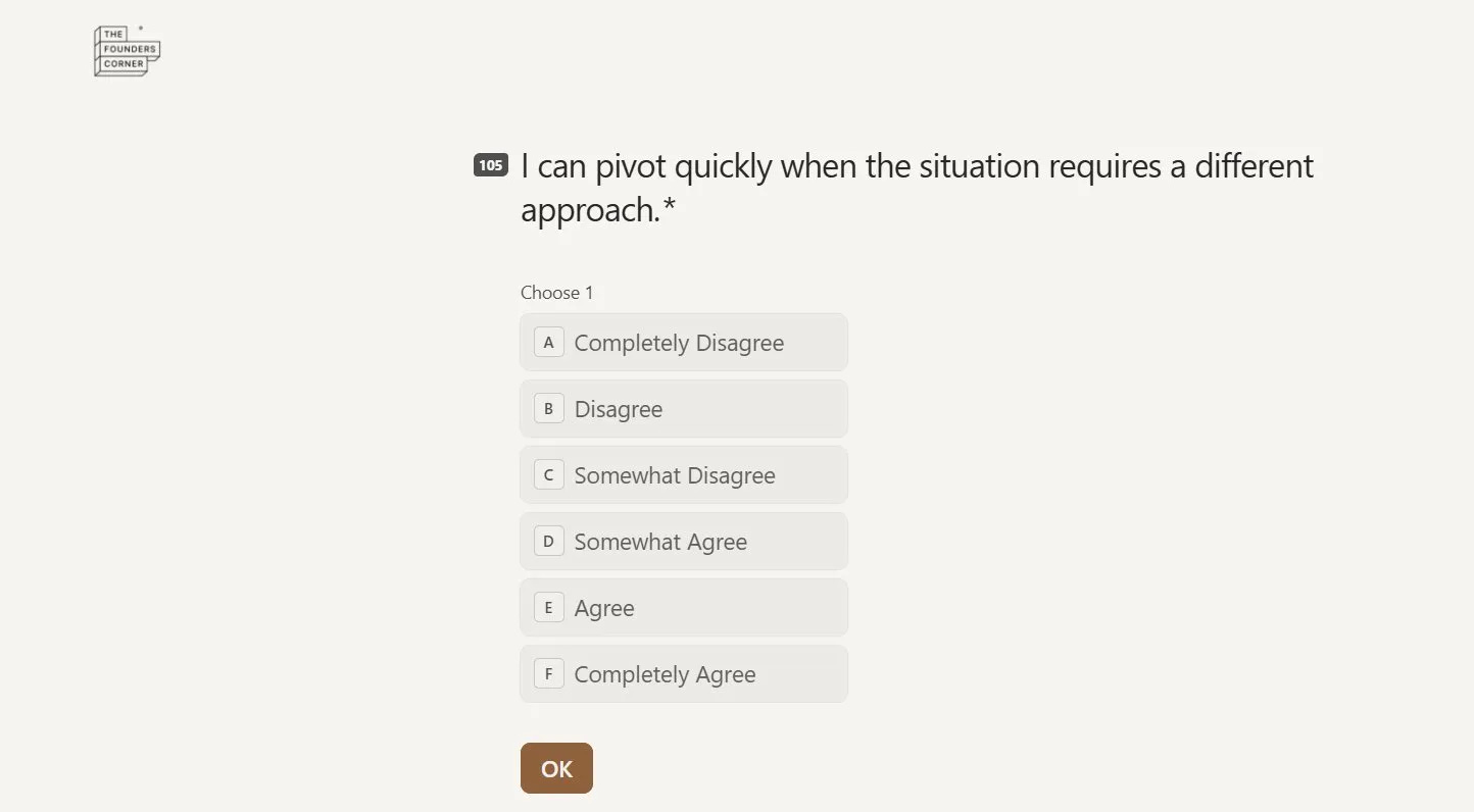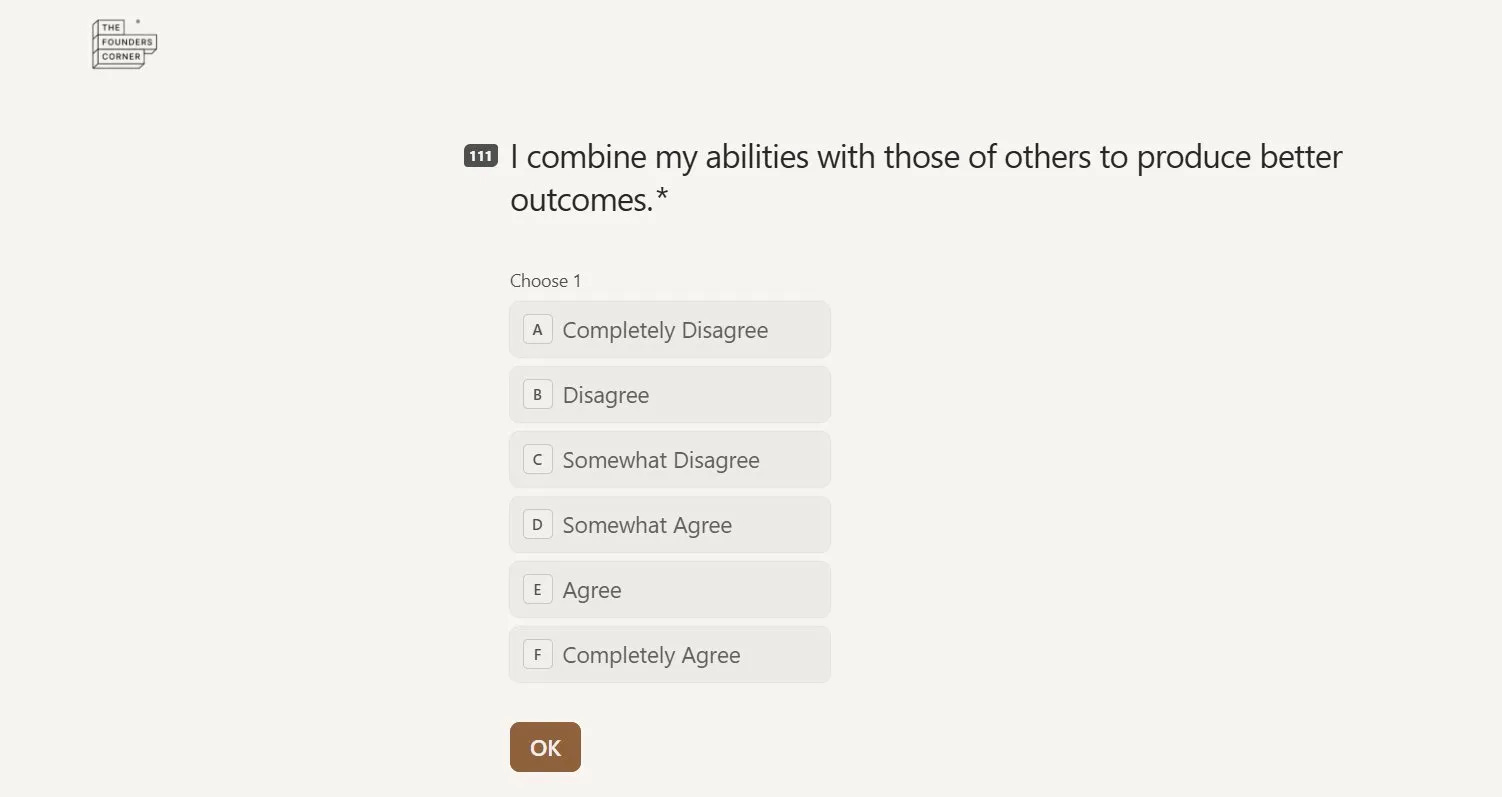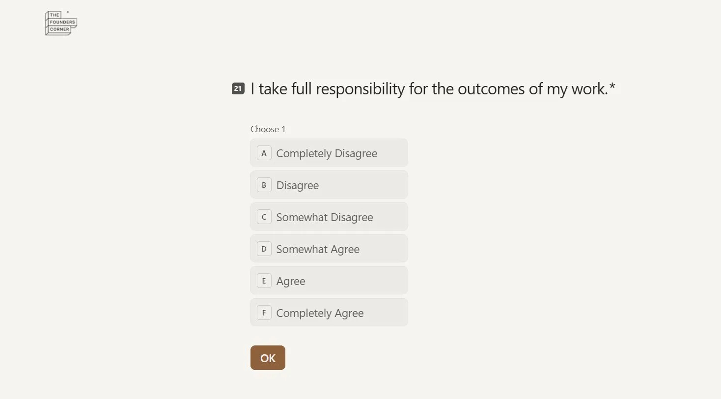 Most founders who complete it say the same thing: they knew some of it intuitively. But seeing it scored, dimensionally, in black and white is different. That is the level of clarity that changes how you think about your co-founder, how you approach your next hire, and how you walk into your next investor conversation.