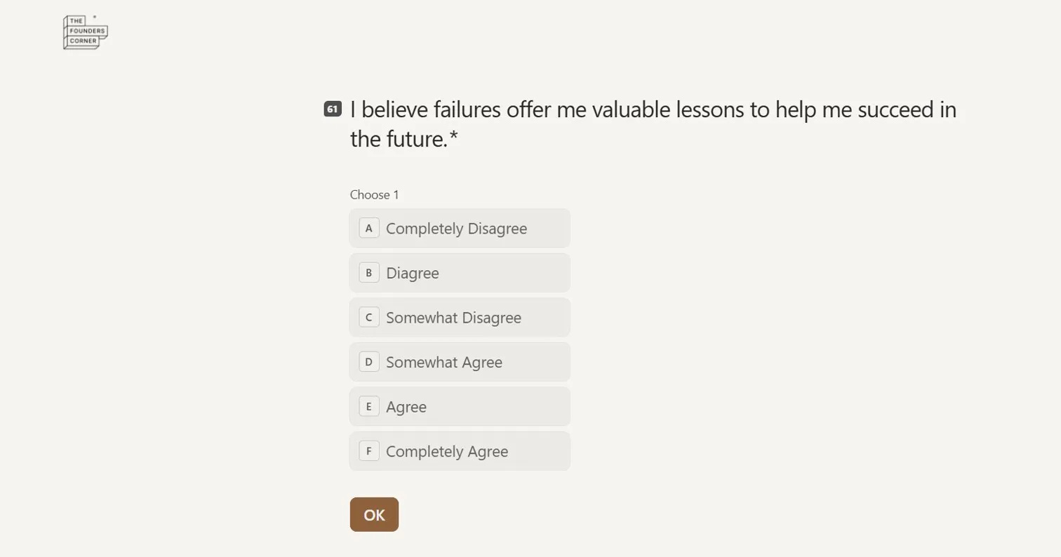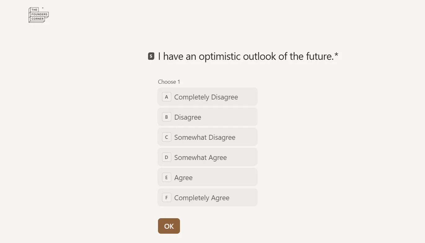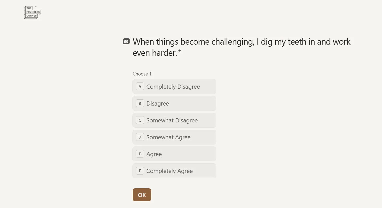 Most founders who complete it say the same thing: they knew some of it intuitively. But seeing it scored, dimensionally, in black and white is different. That is the level of clarity that changes how you think about your co-founder, how you approach your next hire, and how you walk into your next investor conversation.
