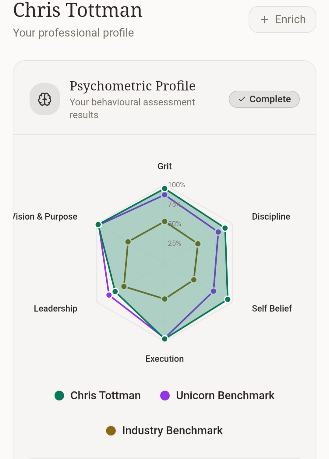 A scored breakdown across all six dimensions - Grit, Discipline, Self-belief, Execution, Leadership, and Vision and Purpose. Your strengths, clearly identified. Your weaker areas, named honestly. The context to understand what each means for the way you lead, hire, and make decisions.