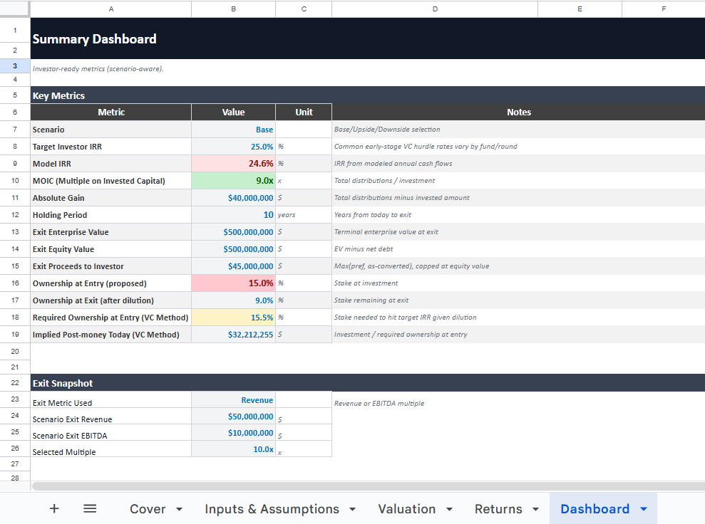 The result is an input page that forces clarity. If you fill in the yellow cells honestly, the model tells you exactly what an investor will see.