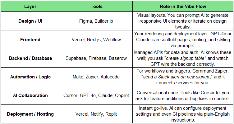 Here’s a practical stack most founders use in 2025, along with how each fits into the vibe workflow: