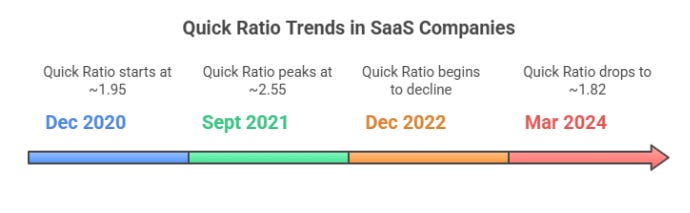 The SaaS industry’s overall Quick Ratio peaked at around 2.55 in September 2021 and declined to approximately 1.82 by March 2024, reflecting a significant cooling in growth momentum driven by rising interest rates, inflation, and a broader correction in tech valuations.